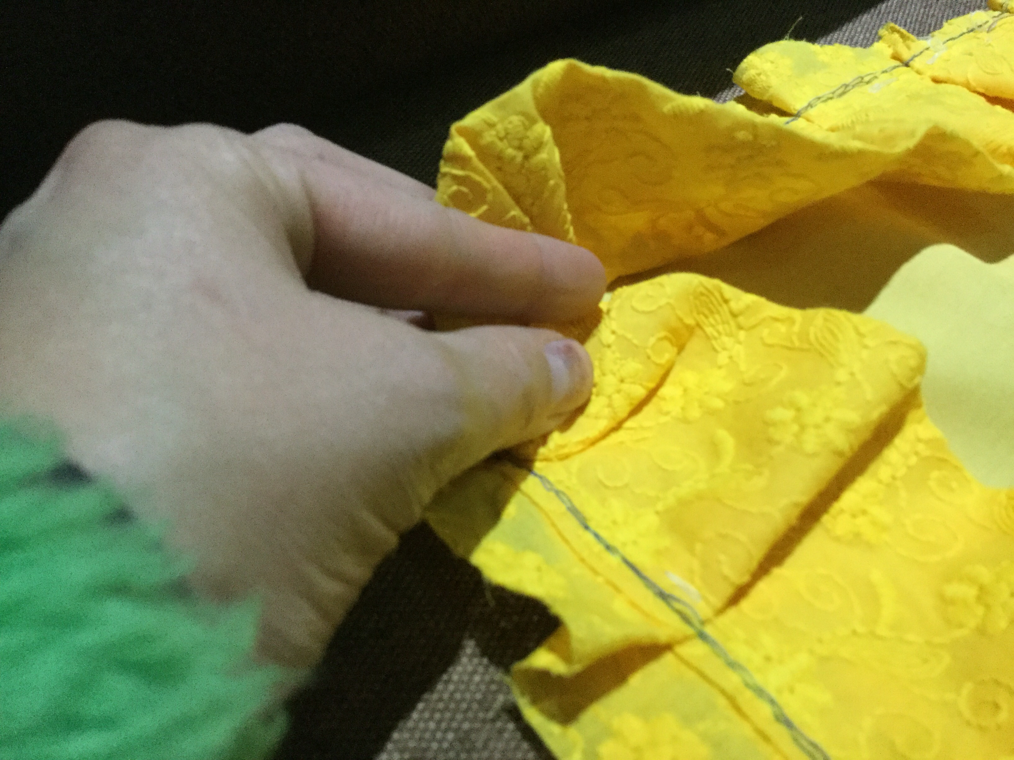 You then need to fold the entire length in half. Right side on the outside. You can pin this but I didn't. Didn't have time for 315" of pinning. Then sew the open edge, so it is now half the size. I don't know that I recommend blue thread:) but that's all I had that day and it actually helped me later see the right line to sew on. I then went thru and sewed a ruffle. I did not measure or pin. I find it easier to measure on my machine. I picked a spot on my machine about 2" from the needle. After I did the first ruffle, every time the fabric reached that chosen point on my machine I would fold it over a very small amount, 1/2" or so. I wasn't super precise. Every time your last ruffle reaches the needle it will be time to feed it again. Hope that makes sense:) keeps me from spending hours pinning.